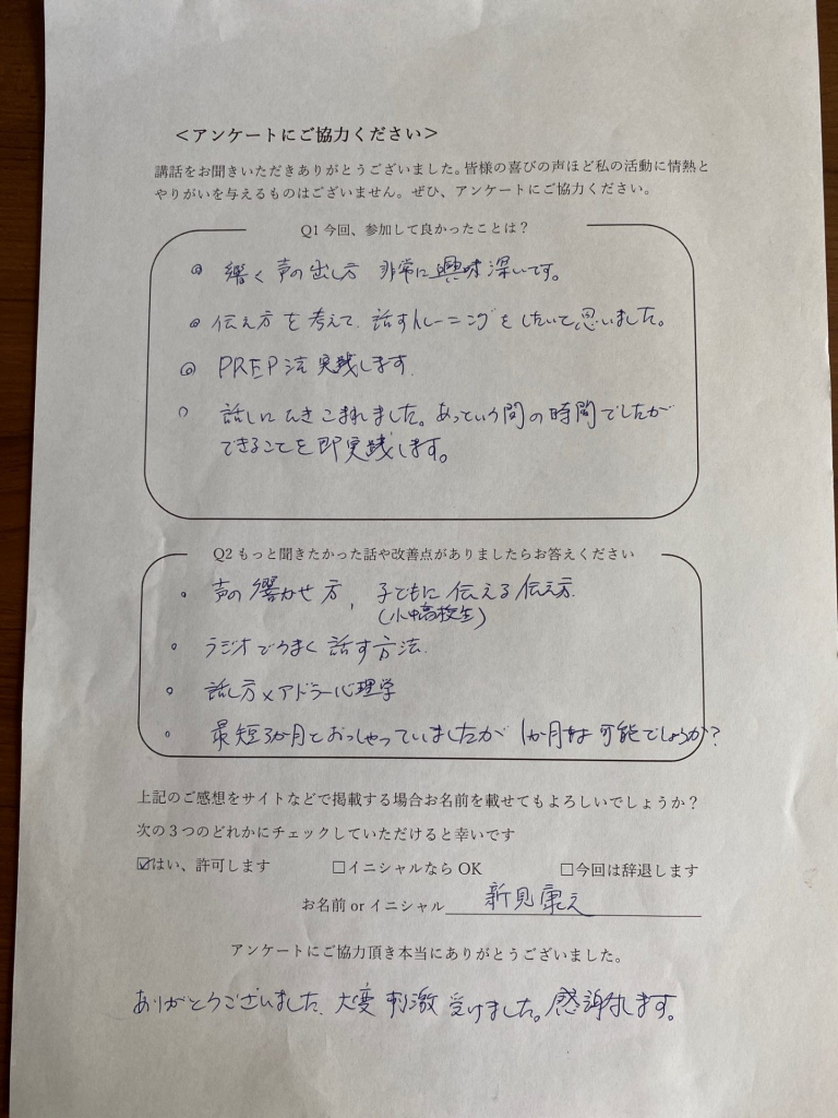 電話応対で、聞きかえされてしまう。人前で自己紹介がうまくできないと悩み、思い切って声と話し方講座に参加しました。講座は、鈴木先生の楽しいトークで、和やかな雰囲気でした。声の基本から、惹きつける話し方など盛りだくさん学ぶことができました。... -