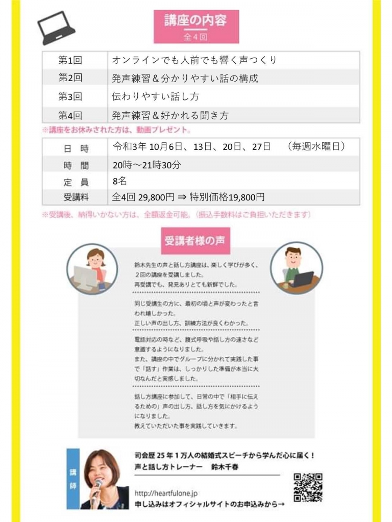 声と話し方講座は、全4回です。
