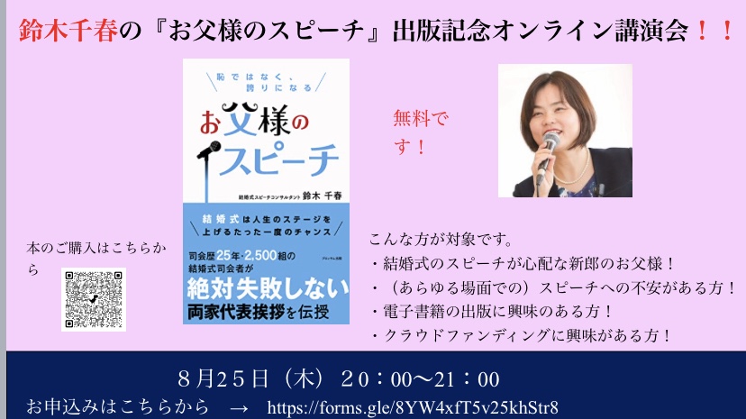 結婚式のお父様のスピーチの出版記念のオンライン講演会を開催していただくことになりました!日時 8月25日(木)20時から参加方法 zoomを使います参加料は無料ですこんな方のご参加をお待ちしています♡・スピーチの悩みがある方、・出版に興味があ... -