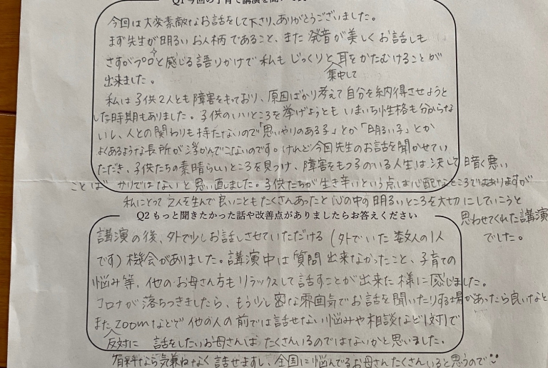 発達障がい子育て講演を聞いてくださったIさんのご感想です